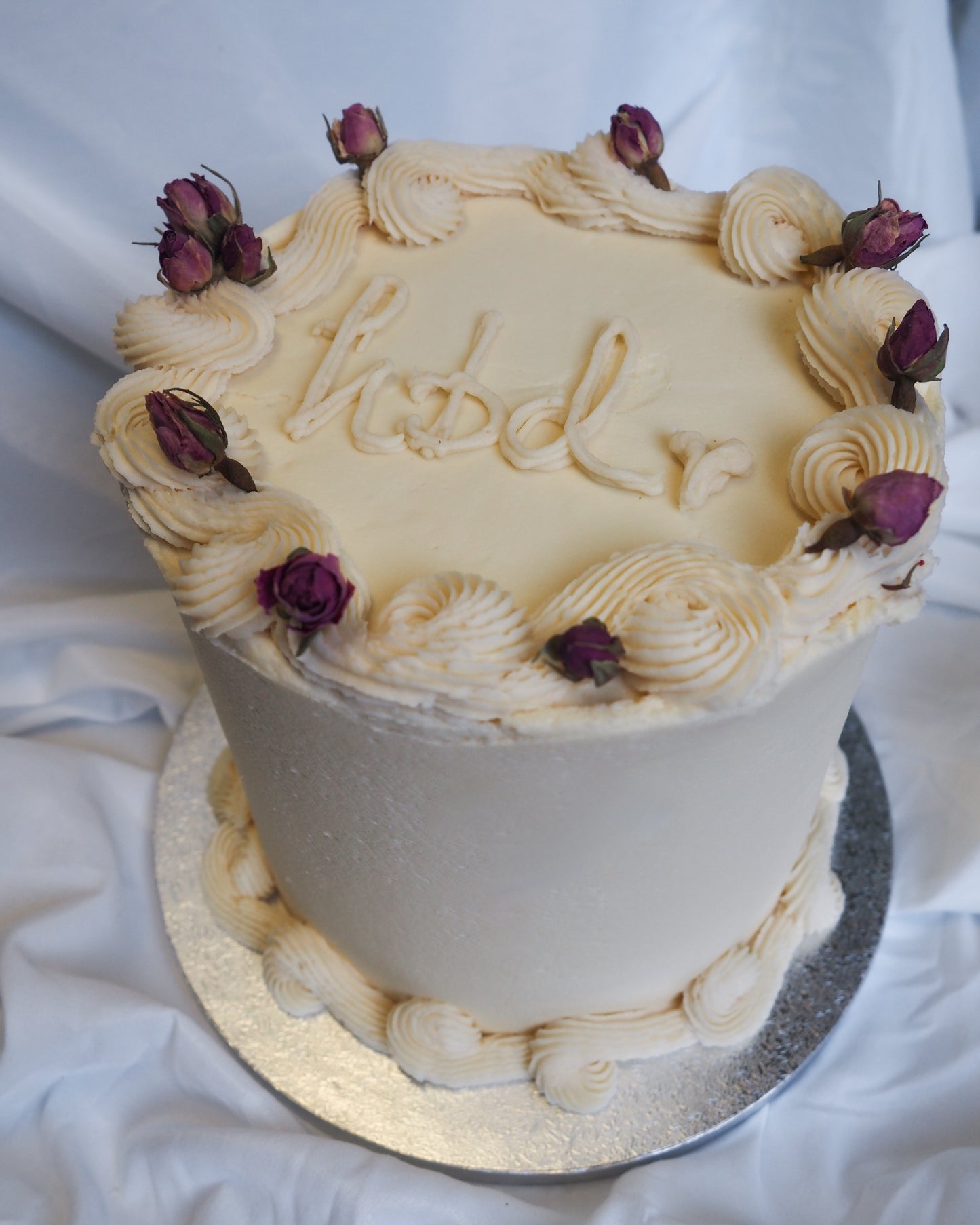 The Classic cake comes vegetarian as standard and is made up of three layers of vanilla sponge with raspberry jam and buttercream filling, fully iced and finished with a buttercream piped crown. Writing is included, however please note we can only accomodate for a maximum 15 characters.